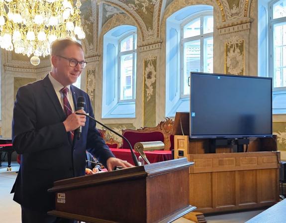 Begrüßung durch Bürgermeister Jan Lindenau. Eine gemeinsame Veranstaltung der Erich-Mühsam-Gesellschaft und der Hansestadt Lübeck.