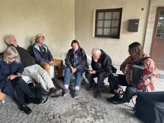 Wie in jedem Jahr trafen sich Freundinnen und Freunde von Erich und Zenzl Mühsam am Grab und gedachten der beiden mutigen Menschen. Leider mussten wir wegen des Starkregens ein überdachtes Plätzchen aufsuchen. Aber auch dort spielte Isabel Neuenfeldt auf dem Akkordeon, es wurde gesungen und rezitiert und das Picknick genossen, das unsere Freundin Susanne Misere jedes Jahr bereitet.